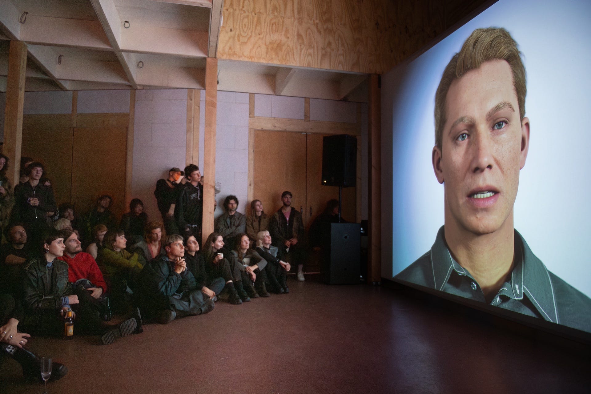 At the start of the performance, the sound comes from the front of the room, where I sit facing the screen, speaking with the AI. The audience sees what I see – it’s a private exchange that they witness from the outside. Later, as the AI begins addressing them directly, the sound shifts from the back of the space. Suddenly, the room opens in on itself, and you feel surrounded by the work, almost inside the system. That spatial change transforms how the piece is experienced, so that it moves from a flat, screen-based encounter to something physical, something that happens with and to you.